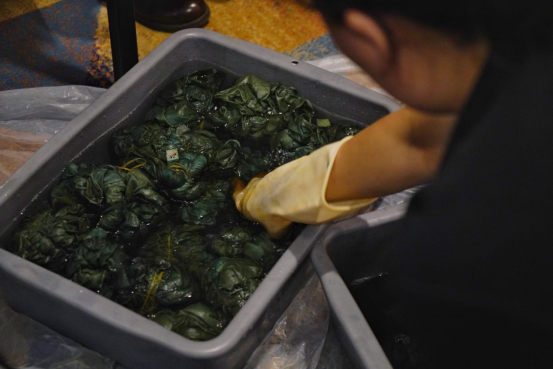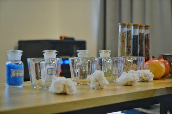 省级非遗传承人吴莹老师通过对“萧山过江布”的由来与历史的介绍,为大家铺垫了理论基础,并演示了“萧山过江布”染制所需的材料与基础的染制手法。本次活动正值秋分前后,结合中国传统二十四节气特色,现场以石榴皮烧煮出的水为基础染料,辅以以明矾、绿矾等物质作为染布的媒介,制作出了灰、绿、黄、棕四种颜色的染料,效果惊艳全场。