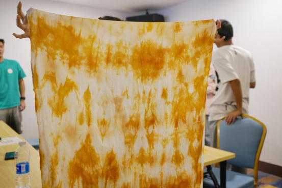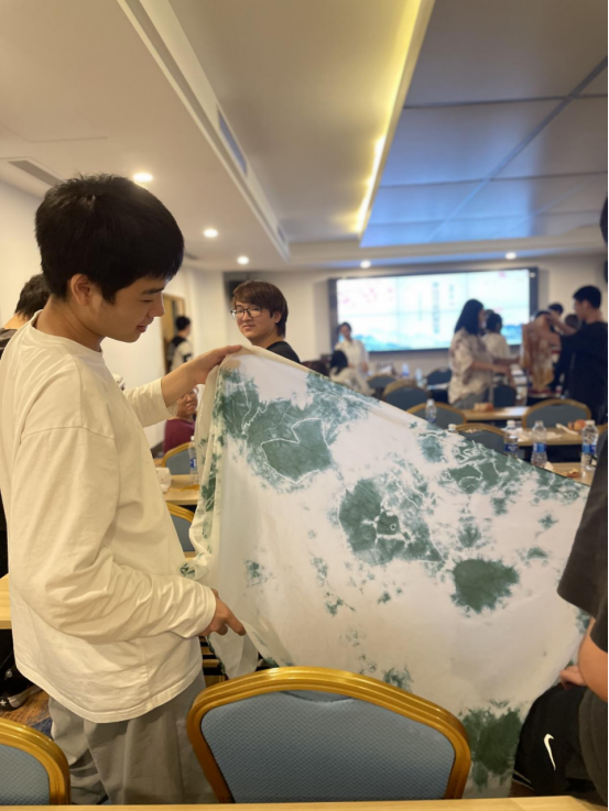 通过老师们的精彩讲解和亲身动手实践相结合,生动有趣的向大家展示了“萧山过江布”草木染的多样魅力,让参与的老师和同学们不仅收获了自制成品的喜悦,更亲身体会到了非遗的魅力。18摄影3班严汝玉同学说道:“我以前在别的地方体验过蓝染、扎染等染布方法,没参加之前以为这一次的体验活动应该也和之前差不多,但是当吴妈妈染出四种颜色花色各异的布料的时候我就被震撼到了,真的太美了,把各个季节中易逝的颜色都留在了布料上。”赵文君同学也表示:“我特别喜欢一个设计师品牌叫PengTai,就是以天然植物做为染料,制作出具有自然浪漫感的衣物,但我今天接触到二十四节气染之后突然觉得我们自己好像也可以创造浪漫。”
