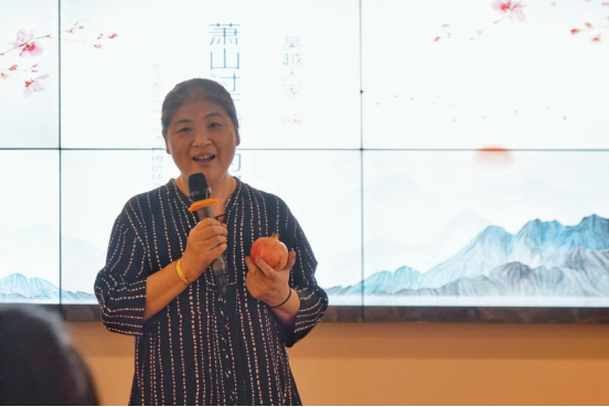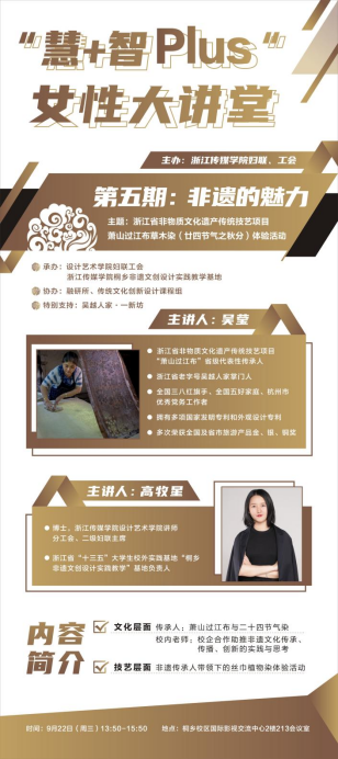 讲师,分工会、二级妇联主席高牧星老师共同主讲。围绕“浙江省非物质文化遗产——萧山过江布与二十四节气染”、“校企合作助推⾮遗⽂化传承、传新、传播的实践与思考”内容展开,通过校地联动合作、理论技艺结合的方式,为参加师生带来一场可听、可赏、可制作、可交流的丰富活动。