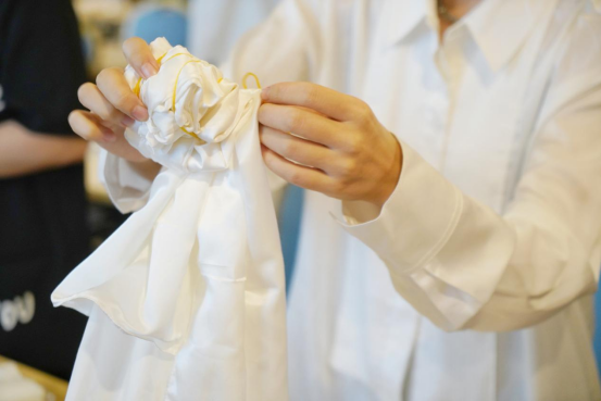 在传承人吴莹、杨洁的指导下,在场师生们纷纷亲手体验了植物染丝巾的全部过程,现场气氛热烈,参与者纷纷表达了对非遗技艺的喜爱之情,成就感满满。