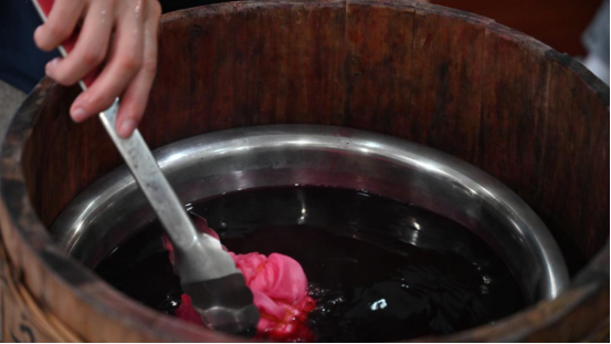 吴莹女士对“萧山过江布”的由来与历史娓娓道来,结合草木染的历史渊源及技术原理进行了详细且生动有趣的讲解,并演示了“萧山过江布”染制所需的材料与基础染制手法。本次活动正值二十四节气的“小雪”前后,吴妈妈结合“黑米”+醋酸烧煮处理为基础颜料,辅以明矾、绿矾等物质作为媒介,现场制作出紫、粉、灰等颜色的染料,效果惊艳众人。