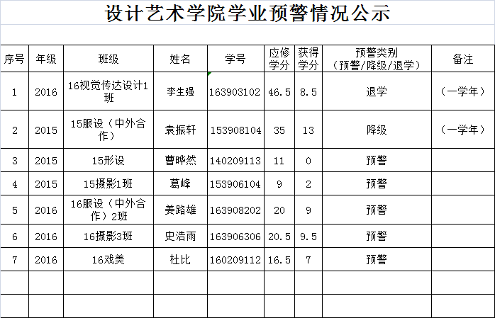 各位班委:本学期学业预警统计工作正在进行,根据统计,有7位同学达到预警条件,其中有1位同学达到退学条件,1位同学达到降级条件,5位同学预警。公示期9月26-9月29日,如有疑问,请公示期间联系教学办。