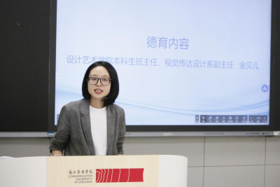 党委书记王丽以《设计为人民,艺术为时代》为题讲授“思政第一课”。她结合设计案例阐释“设计不仅是美学表达,更是社会责任的载体”,鼓励新生“将个人设计理想融入国家文化发展需求,让作品既有创意锋芒,更有民生温度”。