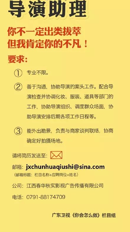 广东卫视《你会怎么做》栏目组招贤纳士啦,够牛你就来试试!招聘岗位:编导、后期编辑、 导演助理、运营编辑,同时每个岗位也招聘大量实习生哦!请将个人简历发送至邮箱:[email protected](邮件标题:栏目名 称+应聘岗位+姓名)并注明“信息来源:媒体招聘信息官方微信”。ps:实习生请在邮件标题补加“+实习生”字样。