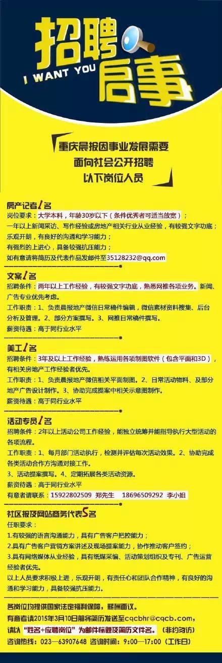你有新闻理想吗?想成为重庆晨报这个有(er)爱(b)的大家庭的一员吗?Duang~好消息!重庆晨报现面向社会公开招聘房地产记者、美工、文案、活动专员、社区报及网站商务代表。有意者请于3月10日前将简历发送至[email protected],并注明“信息来源:媒体招聘信息官方微信”。