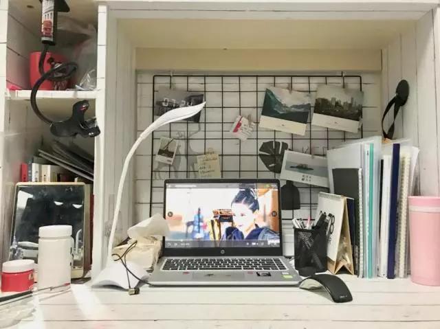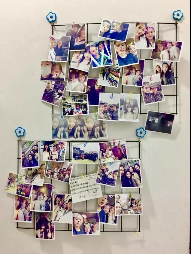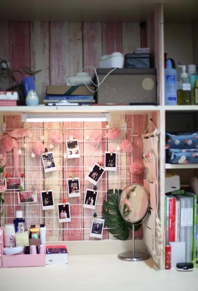 整整齐齐收拾好的桌子,粉色的收纳柜和可爱简洁的粘贴画使桌子更加的丰富和好看,照片墙一张一张的照片,也是我们珍藏心里最美好的回忆。