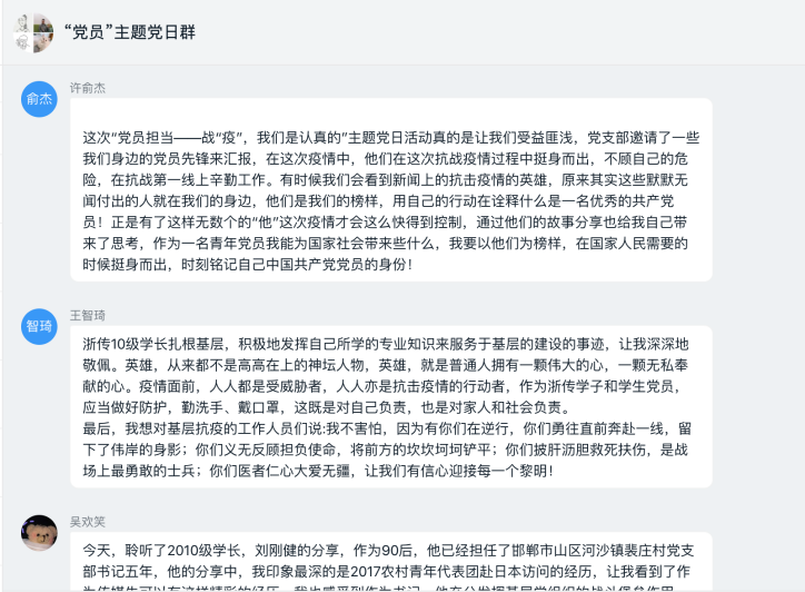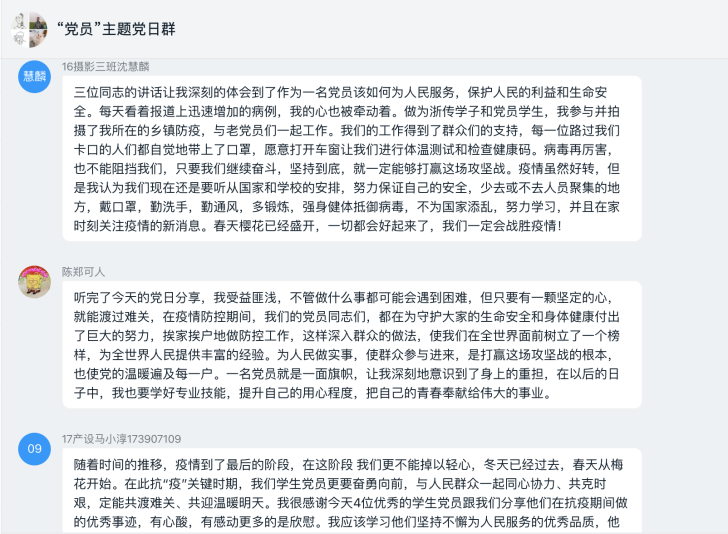 为了进一步学习与发扬习近平总书记给北京大学援鄂医疗队全体“90后”党员回信精神,进一步深化落实广大学生党员不忘初心、牢记使命,始终保持奋斗姿态、发扬斗争精神,进一步充分发挥党员先锋模范作用,教育引导广大学生党员在疫情防控中践行入党誓言、检验初心使命,为坚决打赢疫情阻击战贡献力量。2020年3月23日晚八点,我院举行“党员担当——战‘疫’,有我们”的云上主题党日活动。我院全体学生党员、入党积极分子以及各班级团支部书记参加了此次云上党日活动。