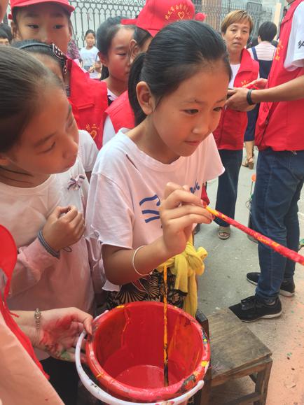 (当地小学生参与体验墙绘绘制、感受红色文化氛围)