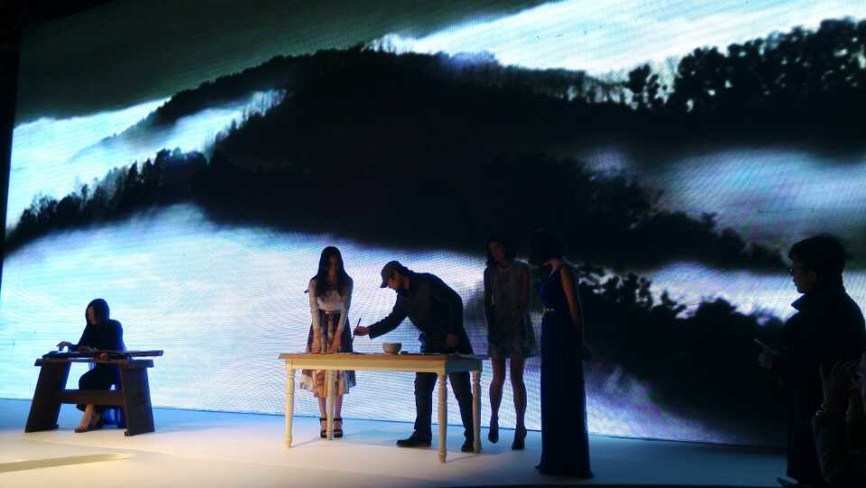 展览现场设置在杭州经纬国际创意产业园的古老大厂房中,开场时,在古琴雅乐声中,陈凌广在台上现场笔墨挥洒出一幅写意作品,赢得了观众的一致赞许。随后18名模特在哈雷车队的引领下的T台走秀,更是将陈凌广教授的意象绘画限量版丝巾的魅力展现到了极致。