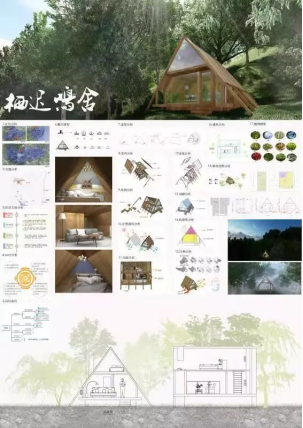 由姚彬、陈金金指导的冯思佳参赛作品主题为《[向——Pop Up Hotel]》,该作品以酒店建筑为背景,经过对比分析后,进行了与时俱进的设计革新,将可移动、可组装、可持续融入到方案中,根据莫干山旅游度假区的地形和地貌,以“山”的造型的设计了一套“方便”、“即拆即建”、“随着季节迁移到最美的景观”的酒店式民宿,建筑则采用大量的木材与玻璃材质,质朴的通透性与山体环境融为一体,体现了还绿予民,还地予民的核心理念。