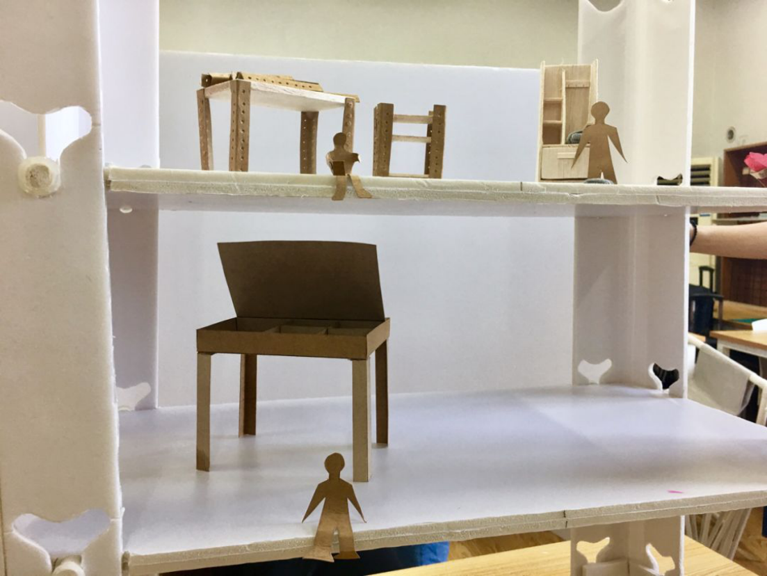 在认真制作模型中,整张的KT板从剪裁量尺,到考虑产品模型的连接方式,经过一系列的思考后,从一张平面草图逐步制成了1:1的实体模型。