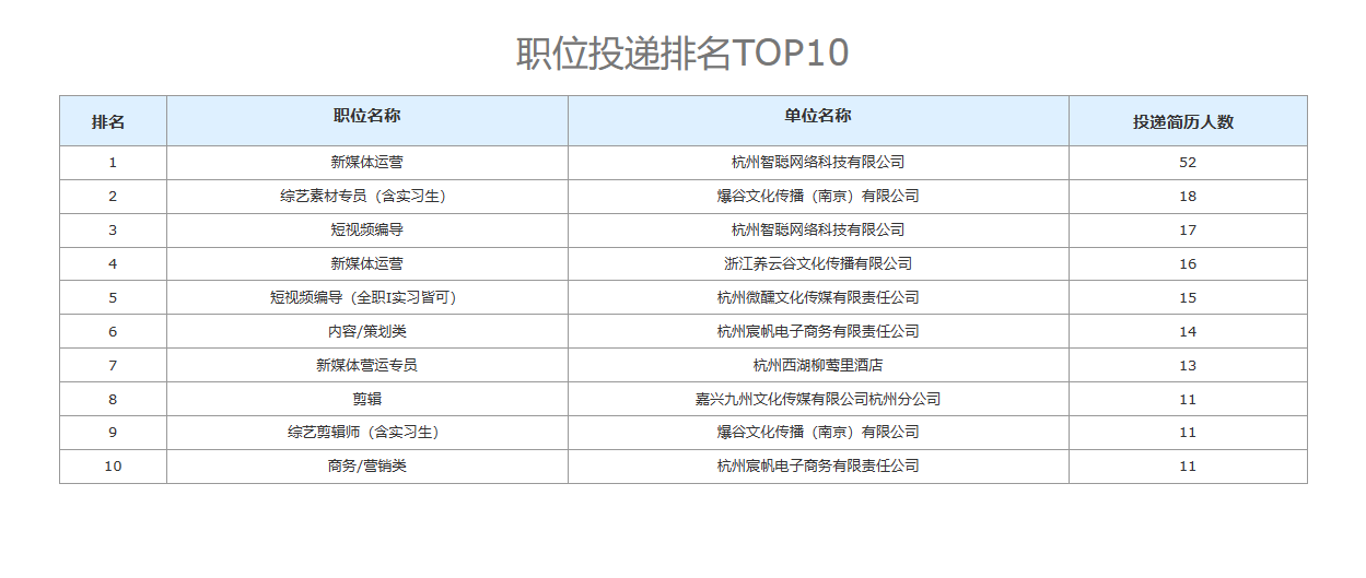 从投递职位情况上看,本次招聘会热门职位投递有新媒体运营、综艺素材专员(含实习生)、短视频编导、新媒体运营、短视频编导(全职实习皆可)、内容或策划类职位、新媒体运营专员、剪辑、综艺剪辑师(含实习生)、商务或营销类职位等。