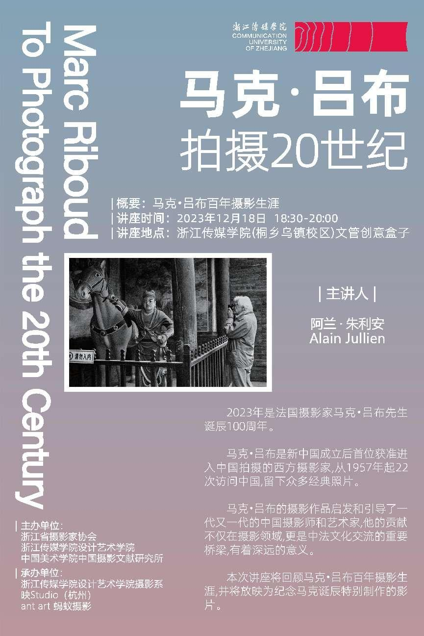 2023年是法国摄影家马克· 吕布先生诞辰100周年,2024年是中法建交60周年。马克·吕布是新中国成立后首位获准进入中国拍摄的西方摄影家,从1957年起22次访问中国,留下众多经典照片。他用影像向世界介绍了中国的发展和变迁,留下众多珍贵的视觉档案。本次讲座系统回顾了马克·吕布百年摄影生涯,并放映为纪念马克诞辰特别制作的影片。马克·吕布的摄影作品启发和引导了一代又一代的中国摄影师和艺术家,在马克·吕布先生百年诞辰之际,回顾他的传奇一生,对于我们深入理解摄影艺术有着非常重要的意义。如何更好地学习、借鉴马克·吕布先生的创作理念,用影像讲述共富浙江的发展故事,让更多人了解浙江的繁荣与发展,这是浙江摄影家和传媒学院的师生们共同肩负的重要使命。
