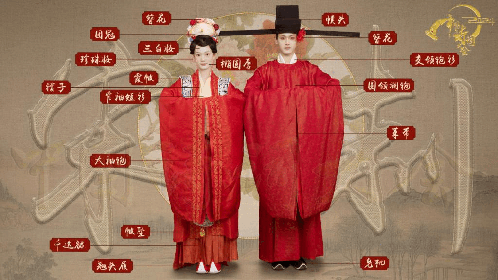 宋代婚礼服饰制度既传承了汉唐的传统,也呈现出新的发展。相较于唐的包容兼并,宋代理学兴盛,尚内敛,服饰不再追求艳丽奢华,而是雅致简洁,色彩淡雅恬静,简洁约略。男子婚礼服为展脚幞头、交领纱袍、圆领袍、裤、报腹、革带;女子婚礼服为大袖衫、褙子、上襦、抹胸、百褶裙、宋裤,佩戴凤簪花团冠,配以珍珠饰面和三白妆。