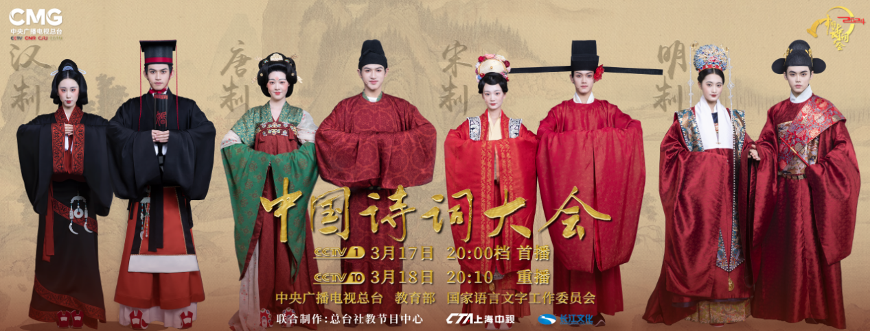 《中国诗词大会》宣传海报,右3、4新人服饰为钱奕帆执行组设计宋代婚服