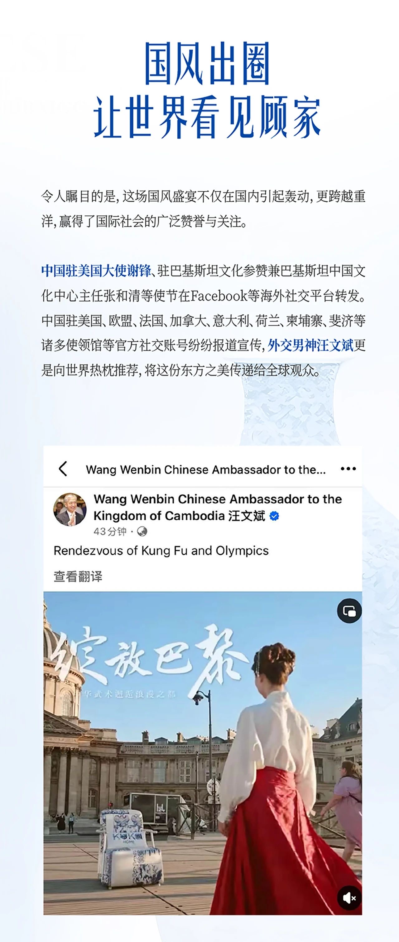 中国驻美大使谢锋、驻巴基斯坦文化参赞兼巴基斯坦中国文化中心主任张和清等使节在Facebook等海外社交平台转发。中国驻美国、欧盟、法国、加拿大、意大利、荷兰、柬埔寨、斐济等诸多使领馆官方社交账号纷纷报道宣传,外交男神汪文斌更是向世界热忱推荐,将这份东方之美传递给全球观众。
