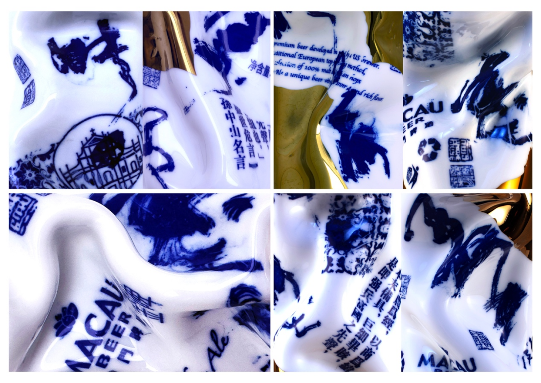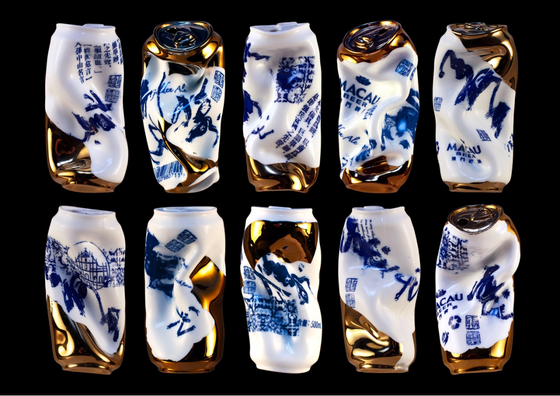 《干杯吧,澳门!》是为澳门啤酒打造的品牌视觉延展设计,通过多媒介和后现代的创作手法,作品蕴含丰富的文化内涵:西方的啤酒罐结合景德镇青花瓷元素,体现了澳门独特的中西文化交融及其“美食之都”的称号,作品中扭曲的易拉罐象征了当代的环保理念,而金莲花、大三巴牌坊及葡萄牙瓷砖图案等细节则展现了澳门的历史进程。此外,啤酒罐上的狂草书法是以荷花为主题的诗句,配搭金色泼洒,既彰显中国书法艺术的力量,又流露出西方抽象表现主义的韵味。罐身上斑驳的字句摘自孙中山的名言,传递了中国近代思想家的治国理念。这一作品不仅表达了品牌的文化内涵,还深入探索了陶瓷元素的开拓性应用。