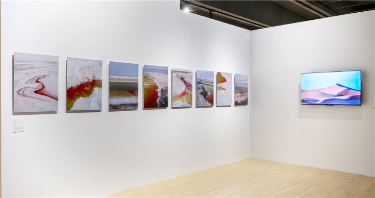 艺术家胡为一的摄影作品拍摄于青海省察尔汗盐湖,由于水分不断蒸发,盐湖上形成坚 硬的盐盖,洁白如雪,湖水也在盐的作用下呈翡翠般碧绿,这是副令人沉醉的奇异景象 。艺术家通过人为的二次介入也完成了对图像的二次提问,把追根溯源这一抹红色的问题,引申到面对遍布人工痕迹的世界,对于我们应该如何重新定义自然发问。