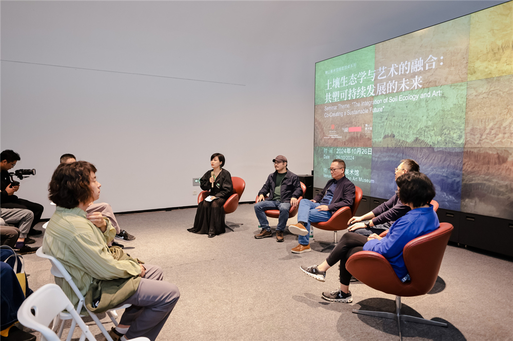开幕式后,馆内组织了一场以“土壤生态学与艺术的融合:共塑可持续发展的未来”为主题的研讨会。艺术家、土壤生态学家、环境科学家、教育工作者等来自不同行业的人群齐聚一堂,共同探讨艺术对传播土壤科学知识和提升公众土壤保护意识的独特优势,并就跨学科合作中科学家和艺术家面对的机遇与挑战进行了探索。在思维的碰撞中,观众们进一步领会土壤的不同性质为艺术本身带来的灵感与生命,感受艺术对沉重的土壤资源利用与保护问题生动具体的转化。