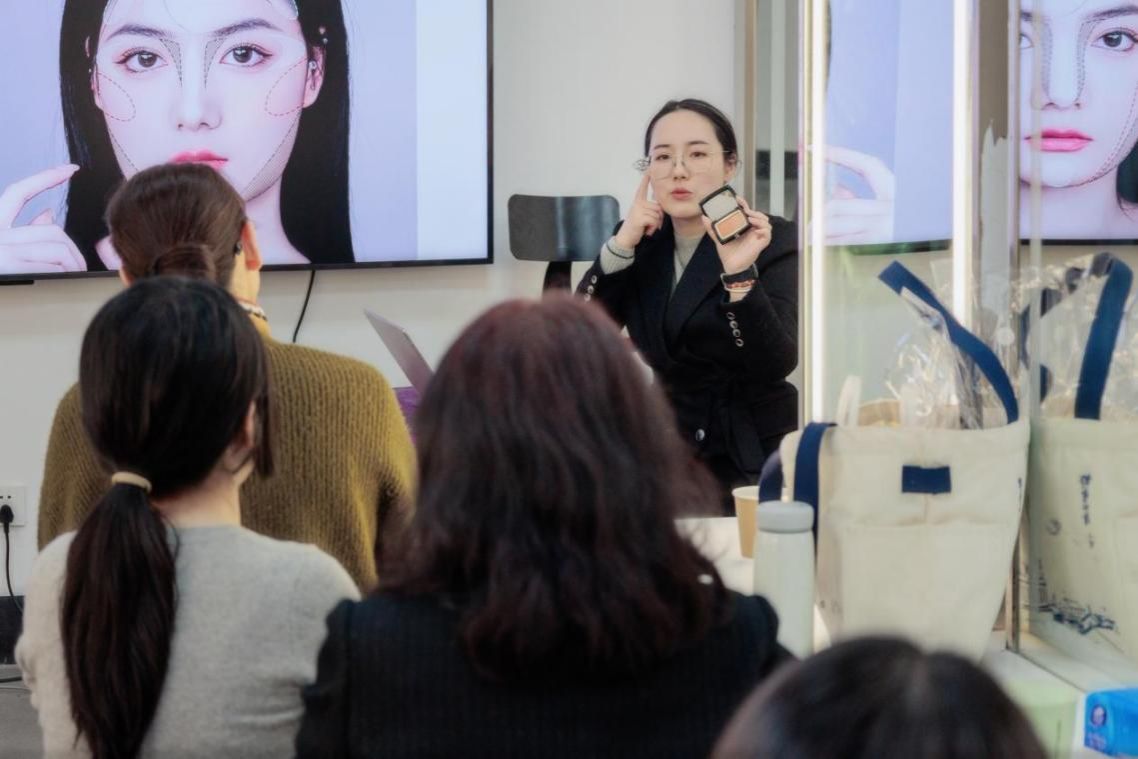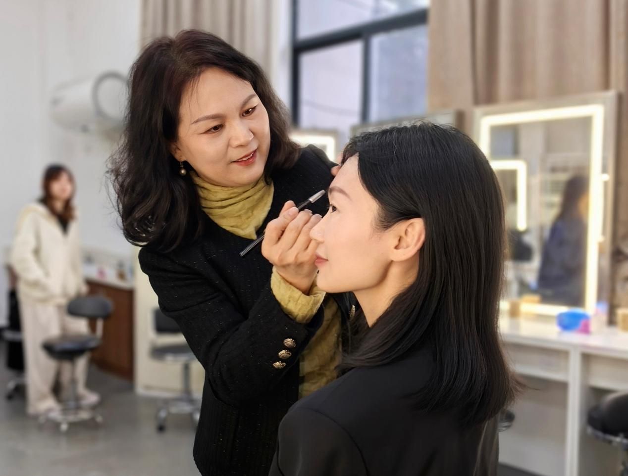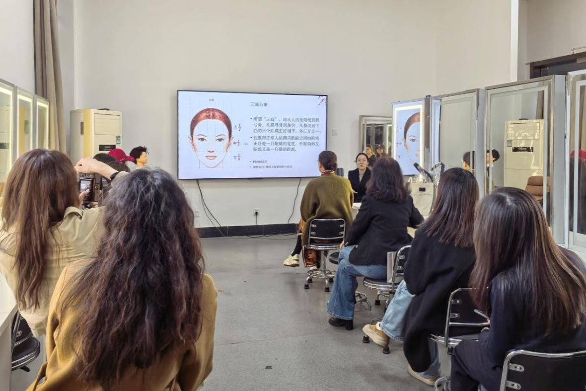 瞿丹姞围绕面部形态分类与特征展开详细讲解,通过现场示范,展示如何根据不同脸型特点打造个性化妆容,为在场教师演示日常职业妆容和生活妆容的基本技巧,指导在场女教师掌握实用的化妆方法。