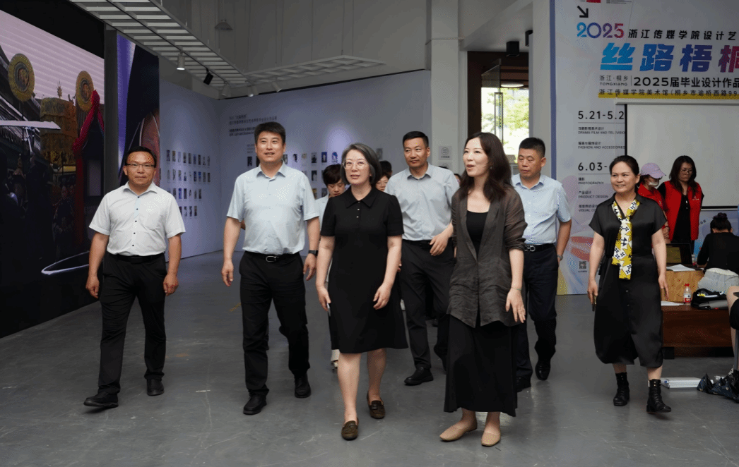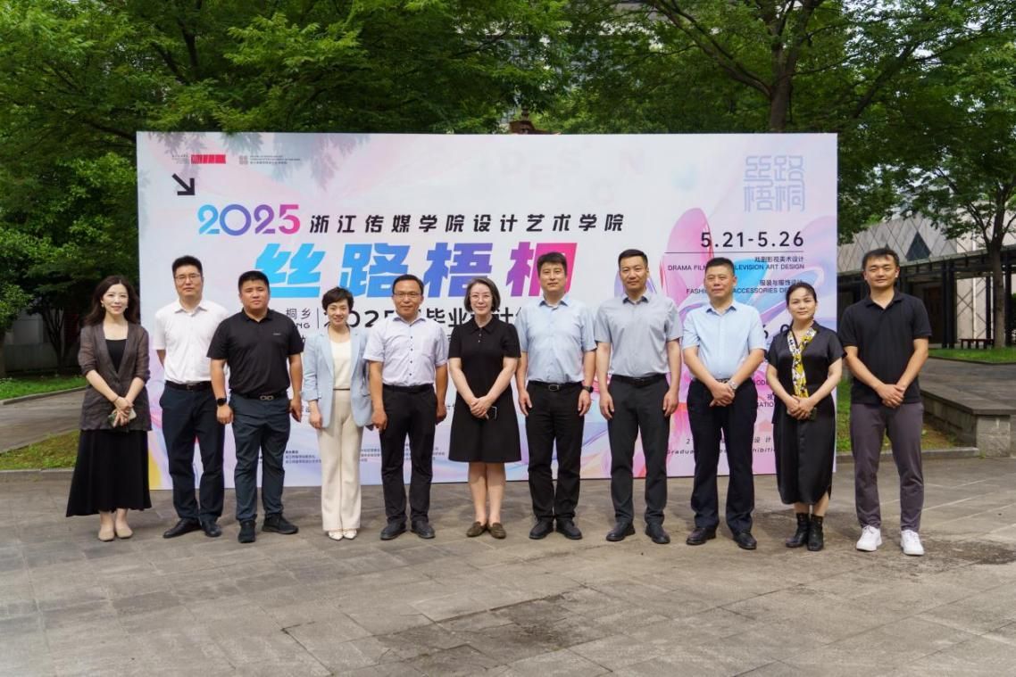 "丝路梧桐"2025届毕业设计作品展。两校领导在戏剧影视美术设计专业展区展开深度对话,共商艺术教育创新发展之道。