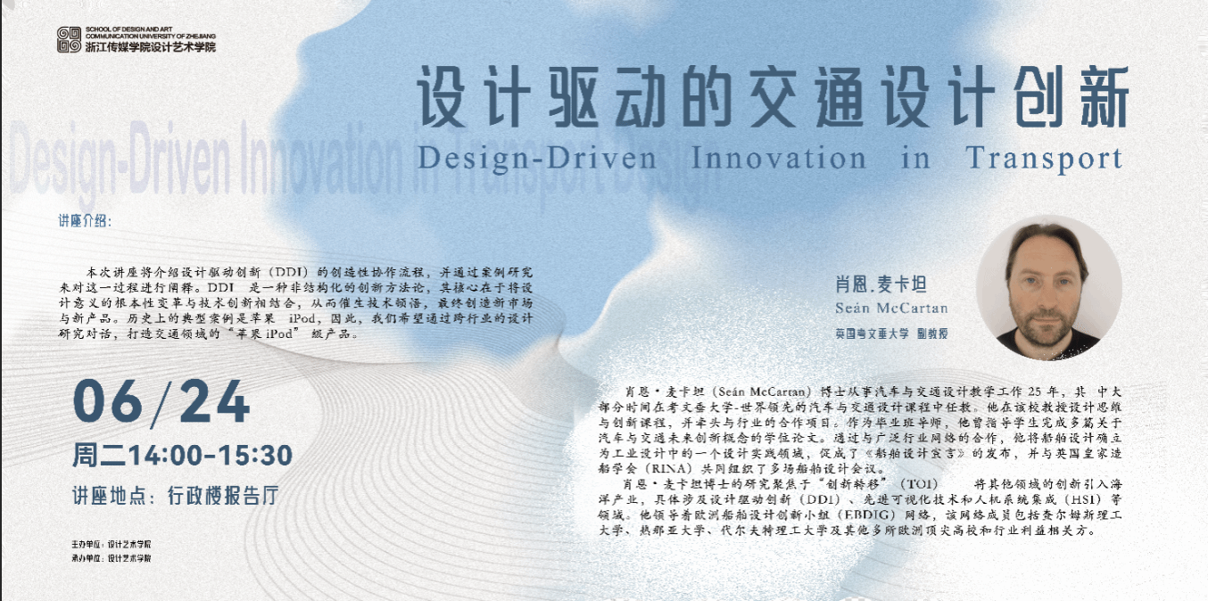近日,英国考文垂大学汽车&运输设计专业Seán McCartan副教授为我院师生带来了一场题为《设计驱动的交通设计创新》(Design-Driven Innovation in Transport Design)的精彩学术讲座。讲座系统介绍了设计驱动创新(DDI)的理念与方法,强调通过将设计意义的根本性变革与技术创新相结合,可以催生"技术顿悟"并创造新市场与新产品。