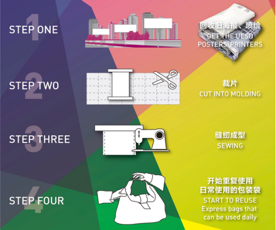 回收和利用废旧的喷绘,仅使用单一材质,通过简单加工,使平面的海报变成立体的袋子,这种袋子扩展性强,装在量大,还能适应不同场景下的功能需求。POSTBAG不仅仅能作为快递包装袋,还能成为日常使用的手提袋。时尚的风格,个性化的定制,鼓励人们分享并循环使用,把原本废弃的材料重新利用成为时尚的标志。