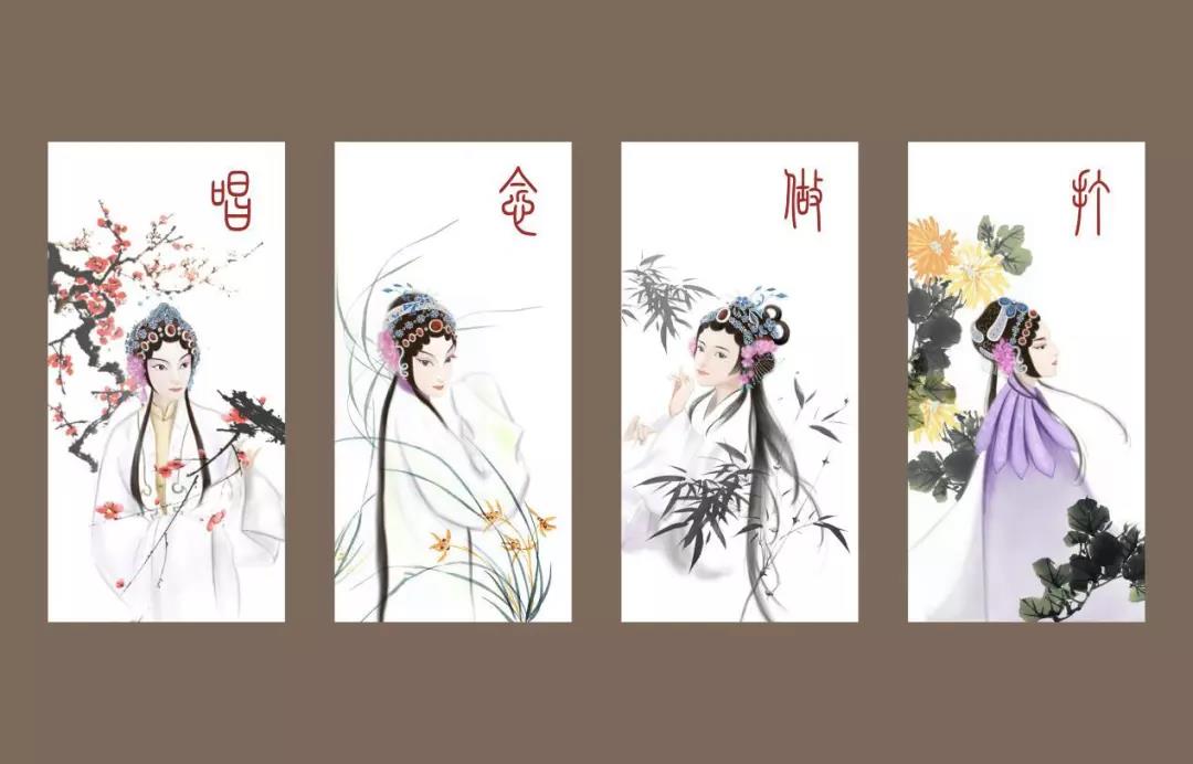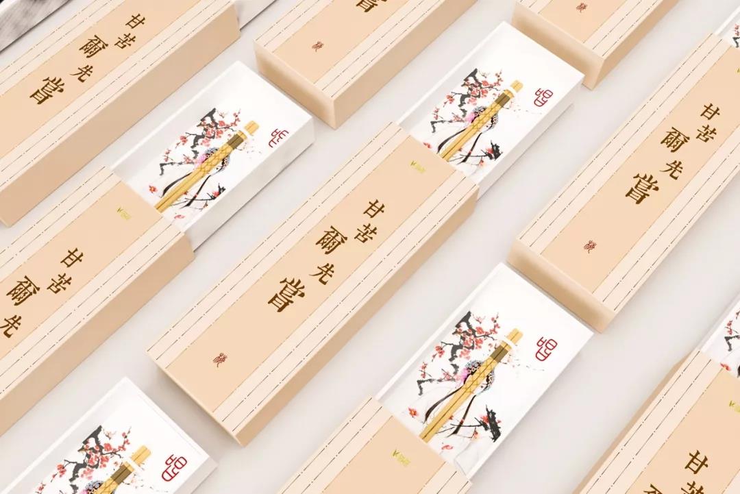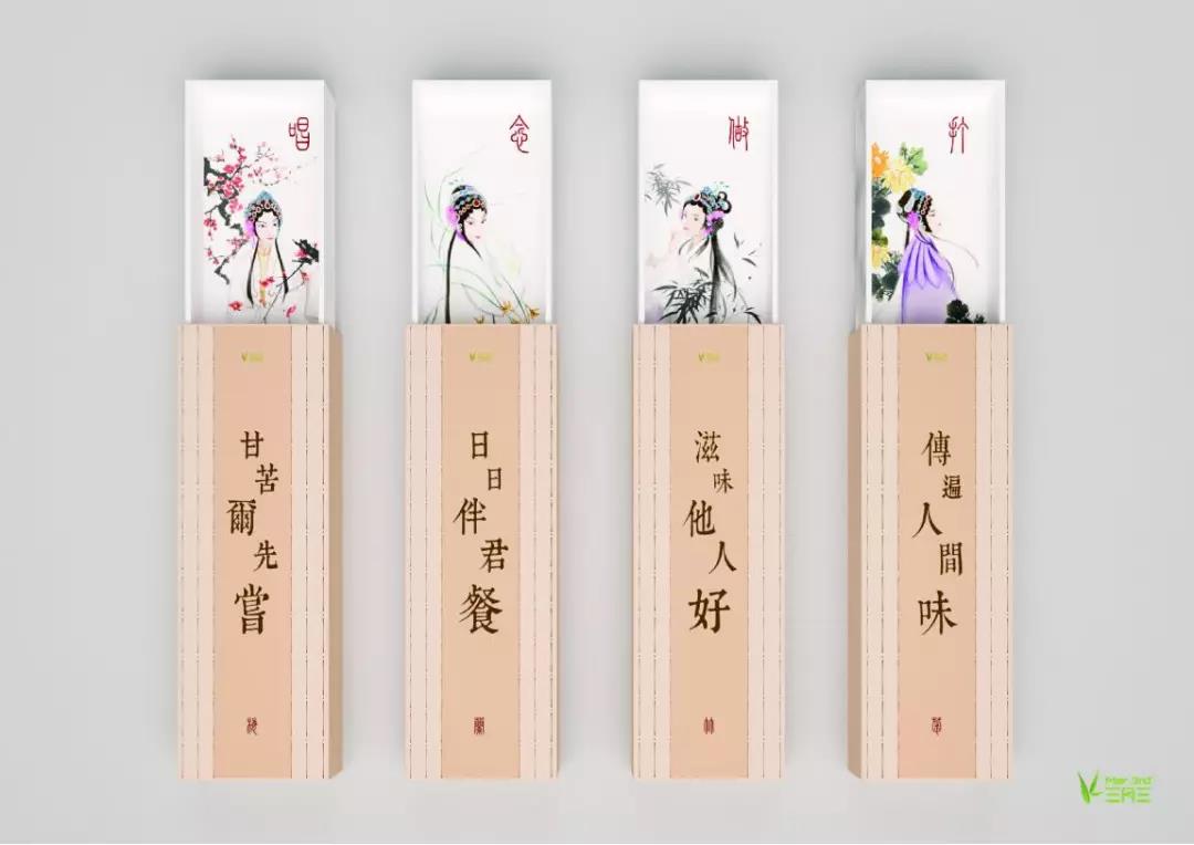 3.产品内包装融入了京剧的青衣形象,并以“唱念做打” 的四种姿态呈现,其中,每个形象又分别对应国画中的梅兰竹菊,整个形象是文化之间的融合,也是对非物质文化遗产的传播。