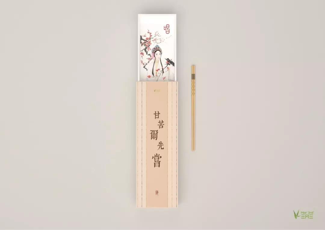 2.产品外包装上镌入了四句关于筷子的古诗,并融入小篆体,赋予了产品深厚的文化底蕴;其底纹部分设计拟竹子的形态,与被包装的竹筷相呼应;