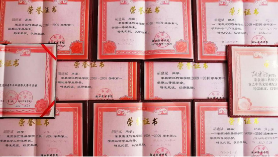 在校期间,胡建斌是个不折不扣的“学霸”,多次荣获一等奖学金、二等奖学金、“三好学生”称号和社会工作优秀奖等荣誉。