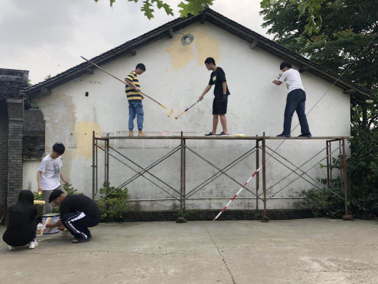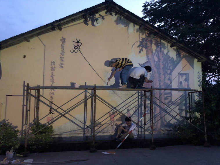 走访完村民了解了村子现状,体验完农民生活后,同学们带着饱满的热情投入了墙绘稿的设计中,在测量的墙体的过程中,墙边的植物挡住了部分墙体,为了不损坏天然植被,我们只好先将它们固定在电线杆上,并且根据植物的位置对设计好的图稿进行了相应修改。墙绘稿确定之后,大家搭好了脚手架,调配好所需的颜料,为墙绘工作做好了充足的准备。